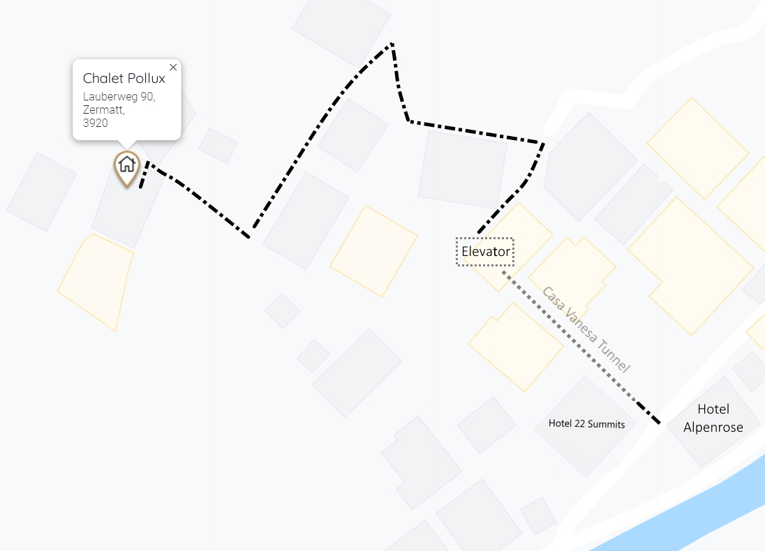 De la gare, vous devez vous rendre à l’ Hotel 22 Summits, Zen Steckenstrasse 4, 3920 Zermatt, et ici sur Google Maps.